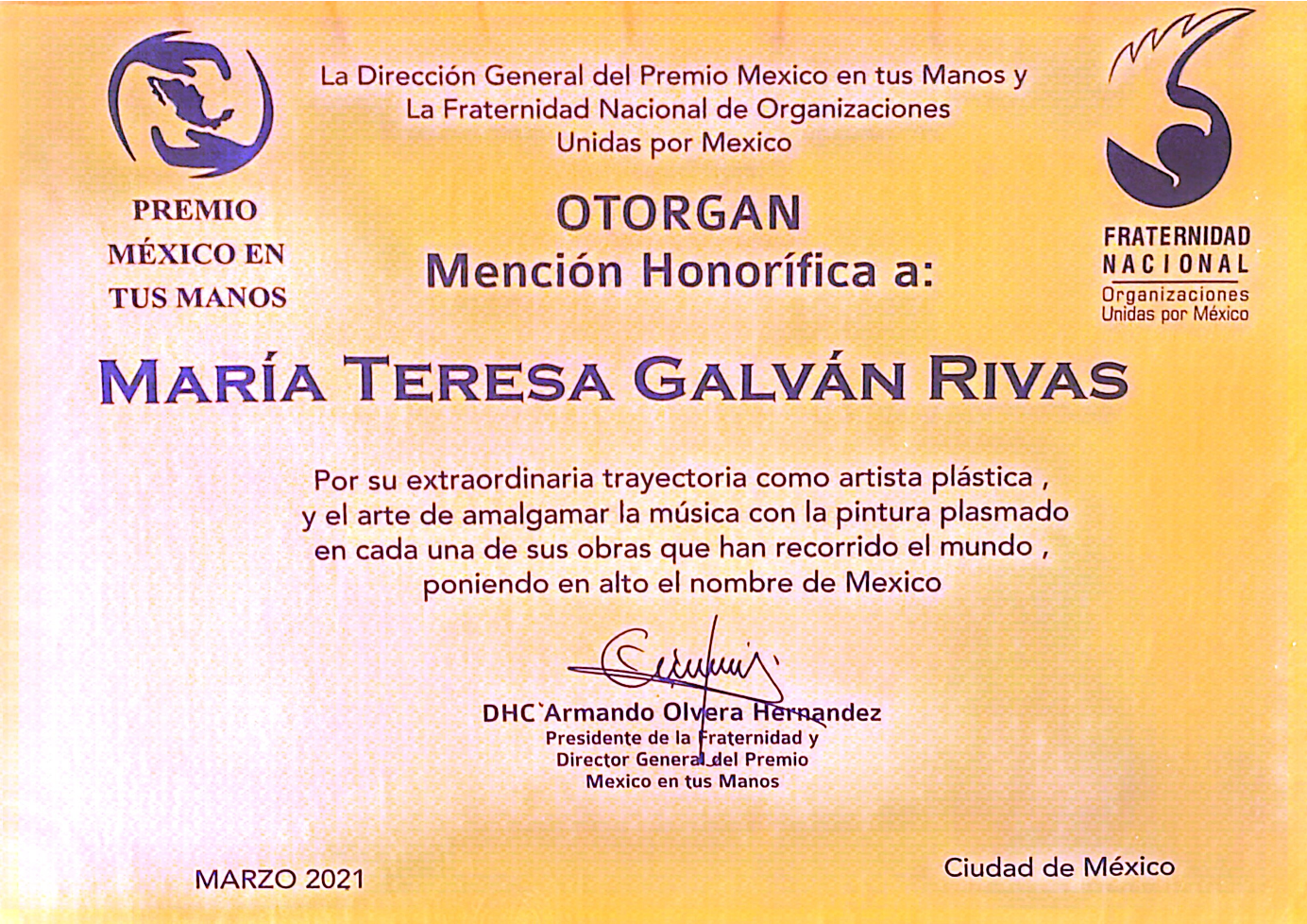 • Galardón Internacional "Mexico en tus Manos".