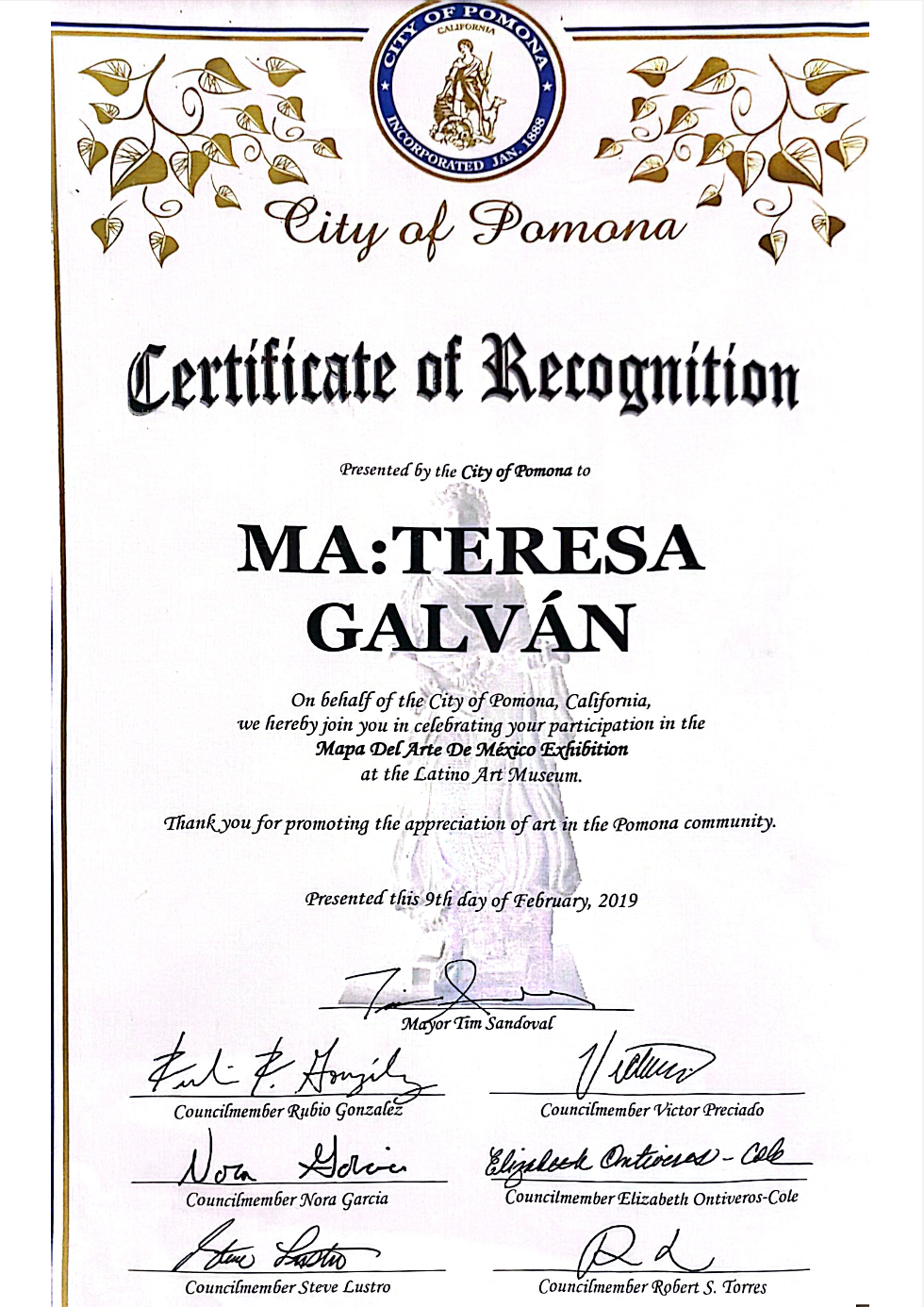 • Reconocimiento por parte de la Ciudad de Pomona, California, Mapa del Arte de México.