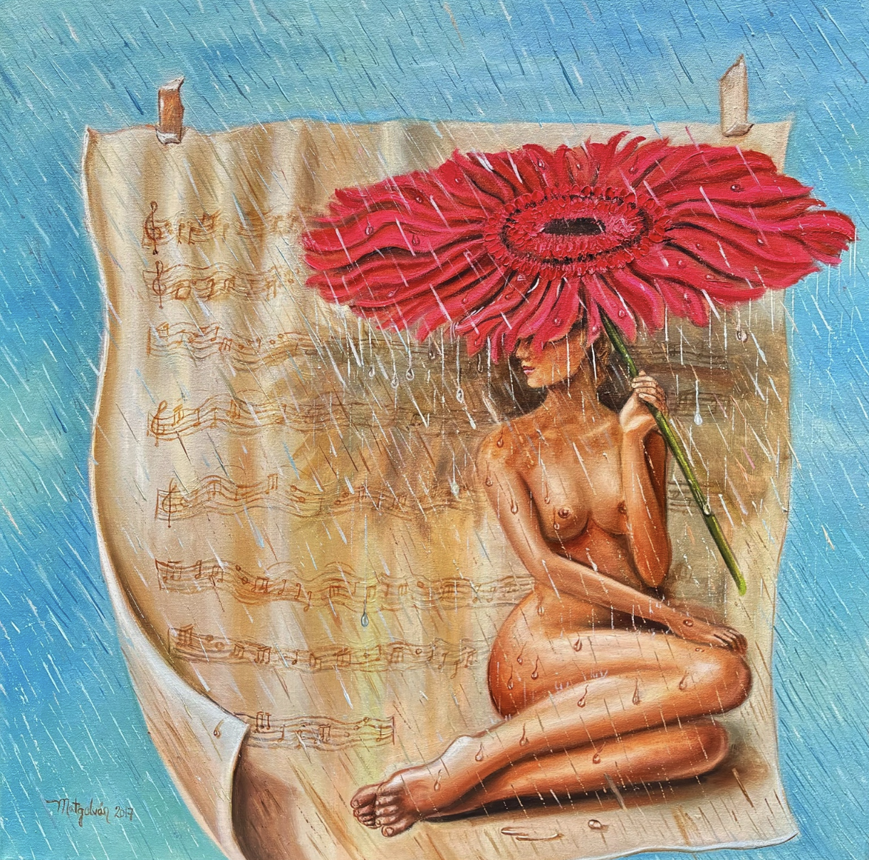 Las partituras, los instrumentos y las formas orgánicas no aparecen como ornamento, sino como extensión del sentir. La música se convierte en atmósfera, en ritmo visual que envuelve a la figura y suaviza la realidad, mientras la naturaleza aporta origen, dualidad y transformación. Frutos, hojas y paisajes funcionan como metáforas de vida, deseo, memoria y renacimiento.