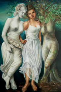 En estas obras conviven lo sagrado y lo humano, la entrega y la fuerza, el silencio y la emoción contenida. El cuerpo femenino, a veces envuelto, a veces expuesto, no busca provocar, sino revelar: es territorio de introspección, de poder interior y de conexión espiritual.